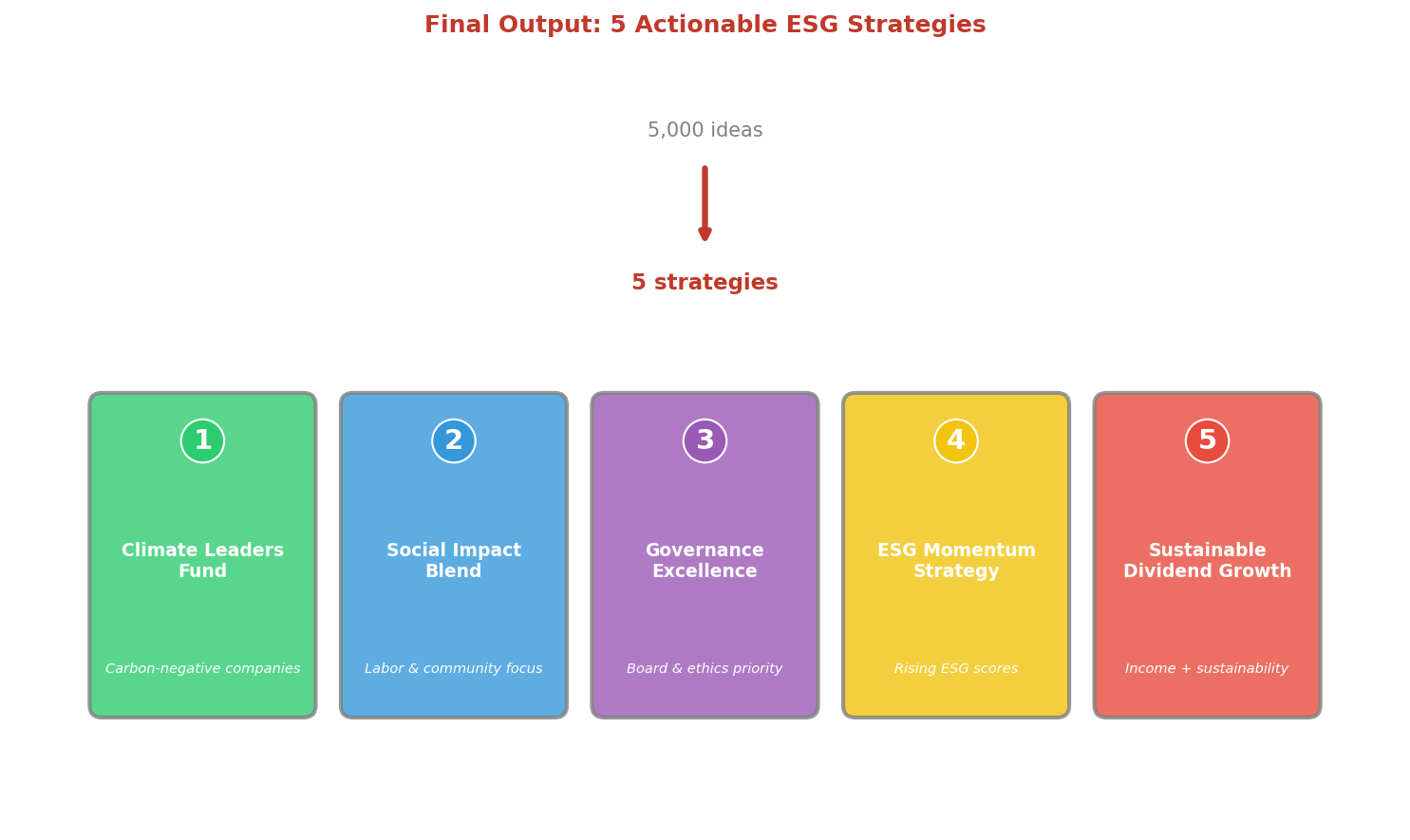 - Apply ML to transform 1 challenge into 5000 possibilities, then converge to 5 strategic solutions